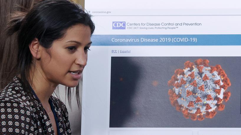Katie Miller, press secretary for U.S. ‪Vice President Mike Pence, helps prepare for the daily coronavirus task force briefing at the White House in Washington, the U.S., March 10, 2020. /Reuters