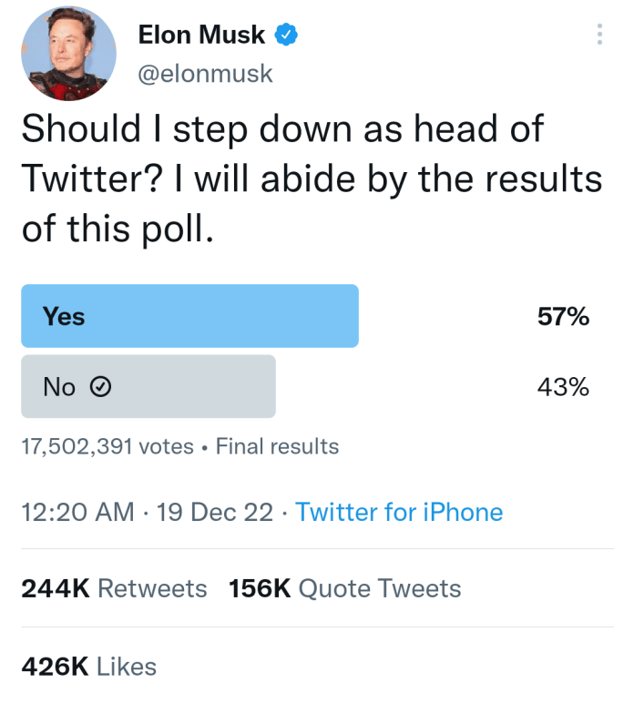 A Twitter poll created by billionaire Twitter owner, Elon Musk asking whether he should “step down as head of Twitter” ended early Monday morning December 19, with most respondents voting for him to step down.