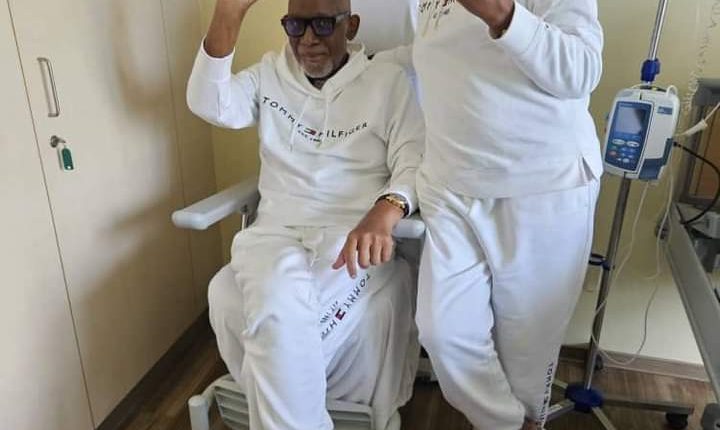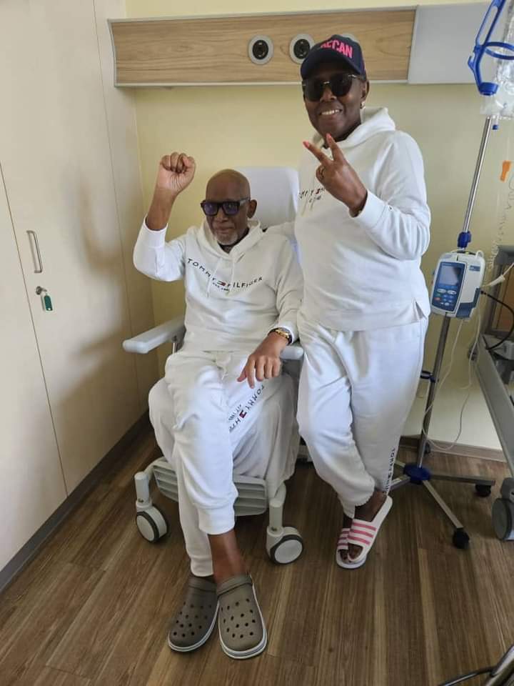 In the picture, a recuperating Akeredolu was seen on a seat beside his sickbed, raising up a clenched fist while the wife, who stood beside him raised the victory fingers.