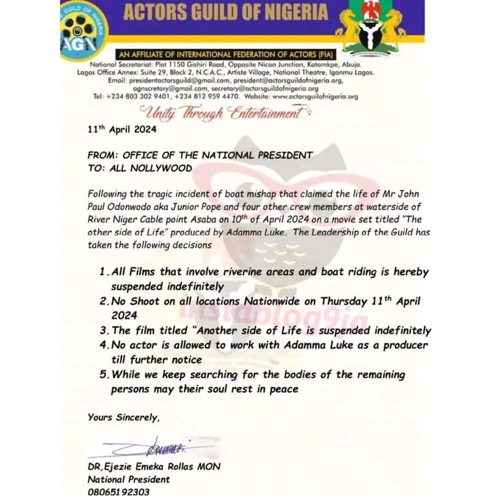 Following the tragic incident, AGN in a statement on Thursday, announced that Adanma Luke who is the producer of the said movie titled Another Side of Life has been suspended from filming till further notice and no actor is allowed to work with her as a producer.