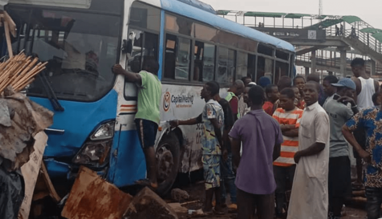 Eye witnesses said a truck conveying cattle rammed into the BRT bus around 6am. According to them, the bus was parked at the bus stop for passengers to board, when the truck speeding truck suddenly rammed into it.