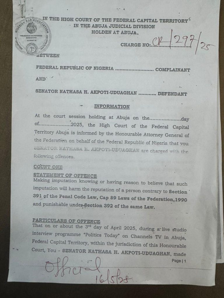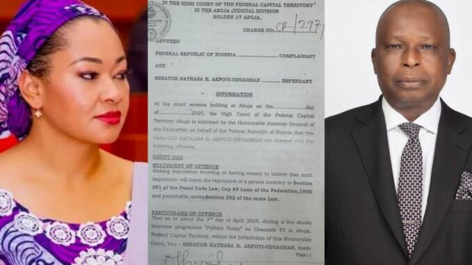 The Federal Government has filed criminal charges against Natasha Akpoti-Uduaghan, the senator representing Kogi Central, over alleged defamatory comments made during a live television appearance, with Godswill Akpabio, Senate President and former Kogi State Governor Yahaya Bello listed as witnesses in the case.